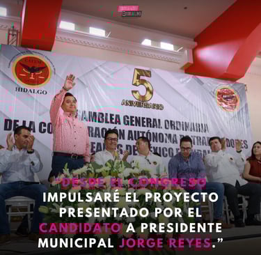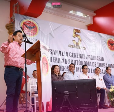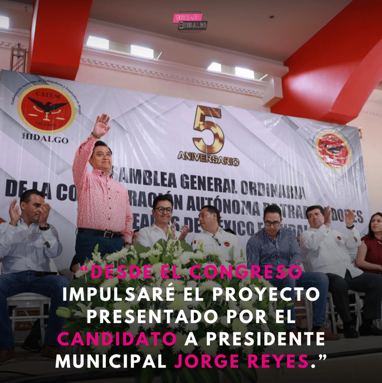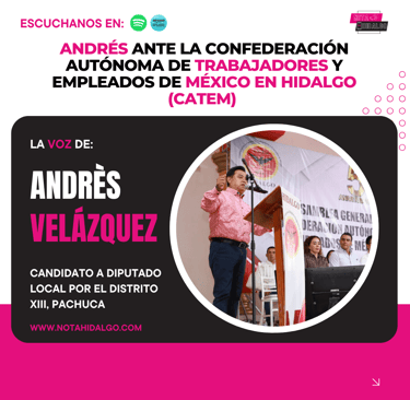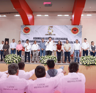 Invitado por la Confederación Autónoma de Trabajadores y Empleados de México en Hidalgo (CATEM) a la toma de protesta de los nuevos comités, presidido por el líder nacional, Pedro Haces Barba, acompañado del presidente local, Francisco Acosta Téllez, además de los candidatos y candidatas a Senadora, Simey Olvera, diputado federal, Ricardo Crespo, presidente municipal, Jorge Alberto Reyes, Imelda Cuellar, entre otros de Morena que fueron respaldados por la organización para obtener el triunfo el próximo 02 de junio del 2024. Andrés Velázquez reiteró su reconocimiento a la CATEM.
