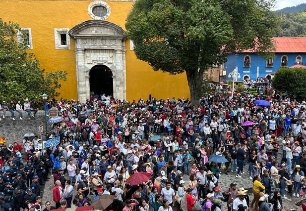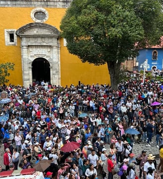 En punto de las 11:30 horas, la lluvia de pétalos dio inicio; dentro de la parroquia, un aproximado de mil personas vivieron este momento, mientras en el atrio y sus alrededores, más personas se reunieron para ser parte de esta tradición de este tradicional pueblo minero.