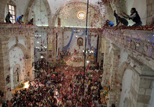 Las calles principales de la parroquia se llenan de tradicionales comercios, y el mercado de artesanías se mantiene abierto para ofrecer una variedad de productos, a la espera de los paseantes que abarrotan el templo para ver caer millones de pétalos de rosas sobre ellos, para despedir la Pascua religiosa.