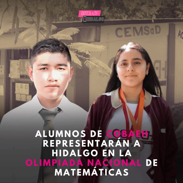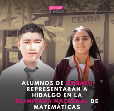 Dos estudiantes del Colegio de Bachilleres del Estado de Hidalgo (Cobaeh) han sido seleccionados para formar parte de la delegación que representará al estado en la trigésimo octava Olimpiada Mexicana de Matemáticas. Janis Marilin Hernández Montiel, de Acoxcatlán, y José Gregorio Francisco Miranda, de El Ixtle, fueron los dos bachilleres que obtuvieron los mejores puntajes en los exámenes preselectivos.