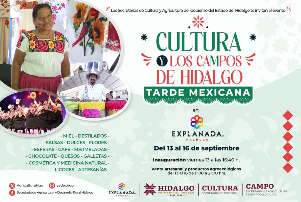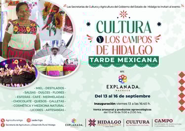 Del 13 al 16 de septiembre, en el centro comercial Explanada Pachuca, se llevará a cabo el evento "CULTURA Y LOS CAMPOS DE HIDALGO", organizado por la Secretaría de Agricultura y Desarrollo Rural de Hidalgo en colaboración con la Secretaría de Cultura. Este encuentro, enmarcado en las Fiestas Patrias, tiene como fin destacar el trabajo de artesanos y productores del campo hidalguense, quienes transforman sus materias primas en productos de alta calidad que reflejan las tradiciones y sabores de la región.