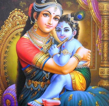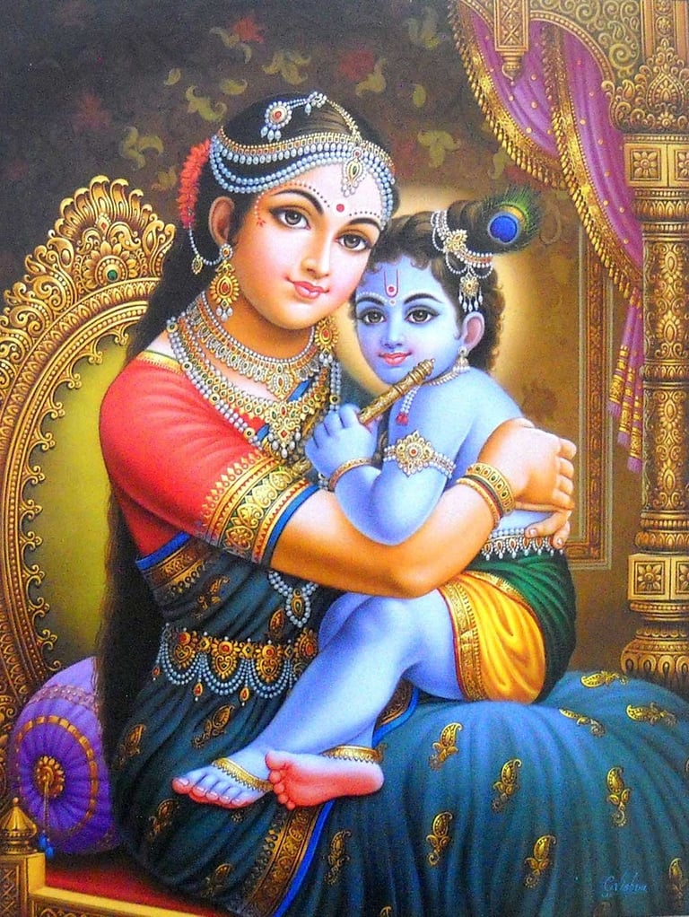 En medio oriente el comercio, la religión y la guerra fluyen de manera horizontal, así vemos a la diosa madre Devaki sosteniendo a su hijo el Dios Krishna en su regazo con ternura y el amor maternal.
