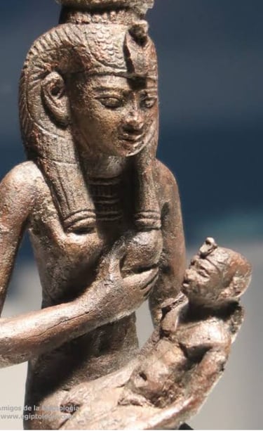 La diosa madre Isis una de las más antiguas y con una liturgia conocida la vemos sosteniendo en su regazo y amamantando a su hijo, Horus, salvador de la humanidad este es un rasgo muy característico de esta diosa madre con la que se daría impulso y aporte litúrgico a las posteriores Diosas Madre evocando la ternura y el amor maternal.