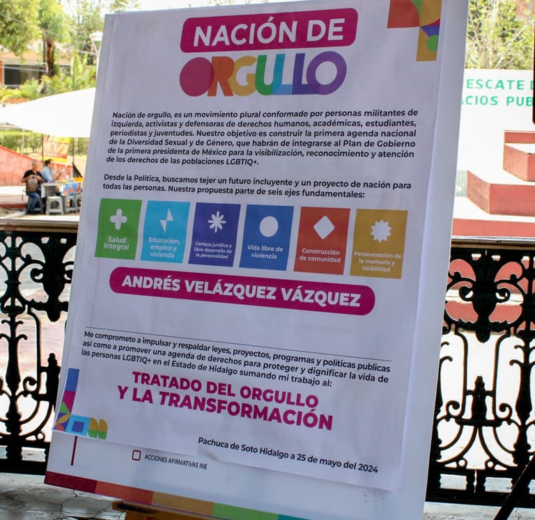 En Parque Hidalgo, acompañado de los representantes de la comunidad LGBTQ+ en Hidalgo, el candidato a diputado local por el distrito 13 de Morena y PANAL, Andrés Velázquez Vázquez signó el acuerdo de Nación Orgullo que promueve 17 puntos a favor de dicha comunidad.
