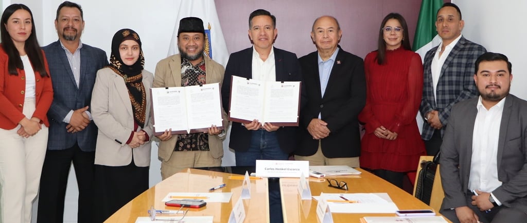Carlos Henkel Escorza, titular de la Sedeco, firmó el convenio junto con Fitra Ismu Kusumo, representante legal de Aseguramiento Halal, en un evento donde también estuvieron presentes Susan Devi, directora de la organización, y Horacio Ríos Cano, subsecretario de Fomento Económico.