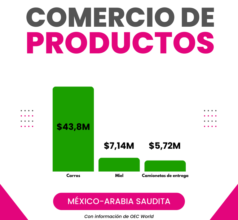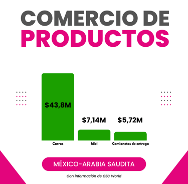 Tan solo en 2022, México exportó $66,3M a Arabia Saudita. Entre los principales productos exportados, la miel figuró en el segundo puesto con una inversión de $7,14 millones de dólares, mientras que el primero fueron coches ($43,8M) y el tercero camiones de entrega ($5,72M). De acuerdo con información de OEC WORLD.