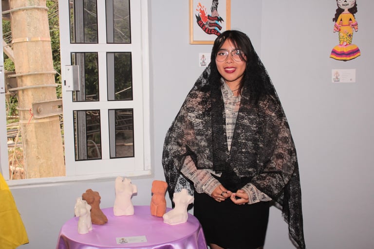 Las colectivas promueven un espacio seguro para revelar el talento de autoras sin límite de edad, por esa razón hasta infancias participaron. Tal es el caso de Kenia, una menor que con entusiasmo exhibió una máscara hecha de foami moldeable y el mismo día de la apertura cumplió 9 años.