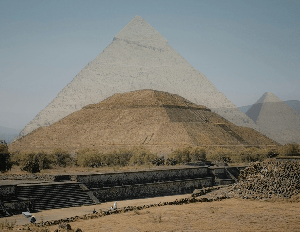 Soy un afortunado en conocer ambas pirámides y son construcciones imponentes, generan una sensación especial te ubica que eres un elemento del universo. Y sucede así cuando el último rayo de sol de la tarde toca la pirámide del Sol de Teotihuacán, en Egipto toca a la pirámide de keops el primer rayo de sol de la mañana. Dichas culturas no se conocían y con una diferencia de las construcciones de 2600 años aproximadamente. Están alineadas en el mismo sentido.
