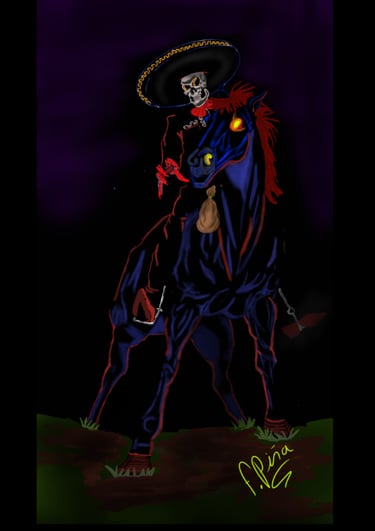 El charro negro recorre los pueblos y sus caminos en la provincia de México en un potente caballo negro de ojos rojos centelleantes, una lujosa silla de montar piteada con filigranas de oro y herraduras destellantes en cada pisada.