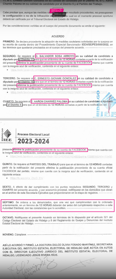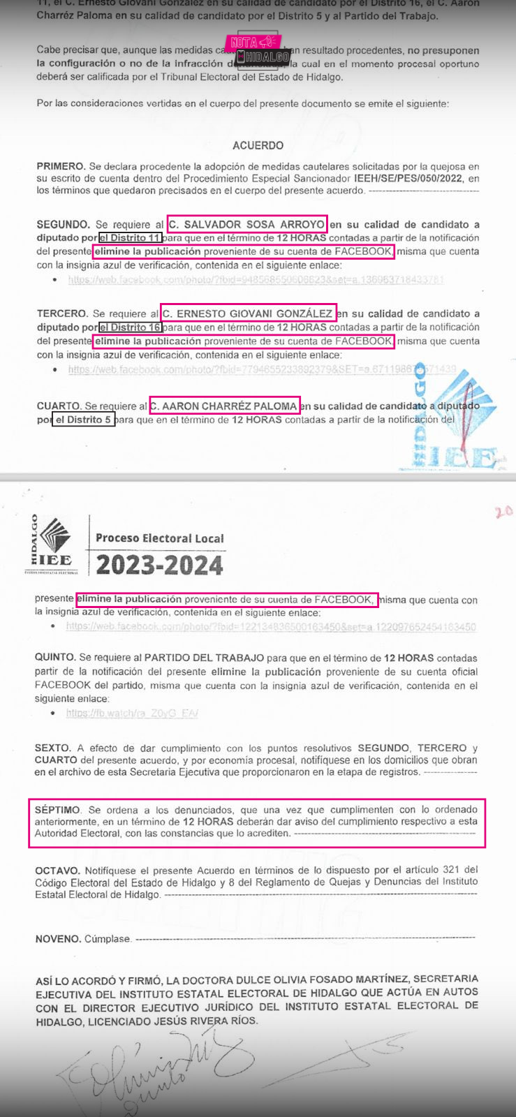 Orden dictada por el IEEH / Twitter: Leonardo Herrera
