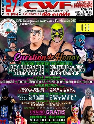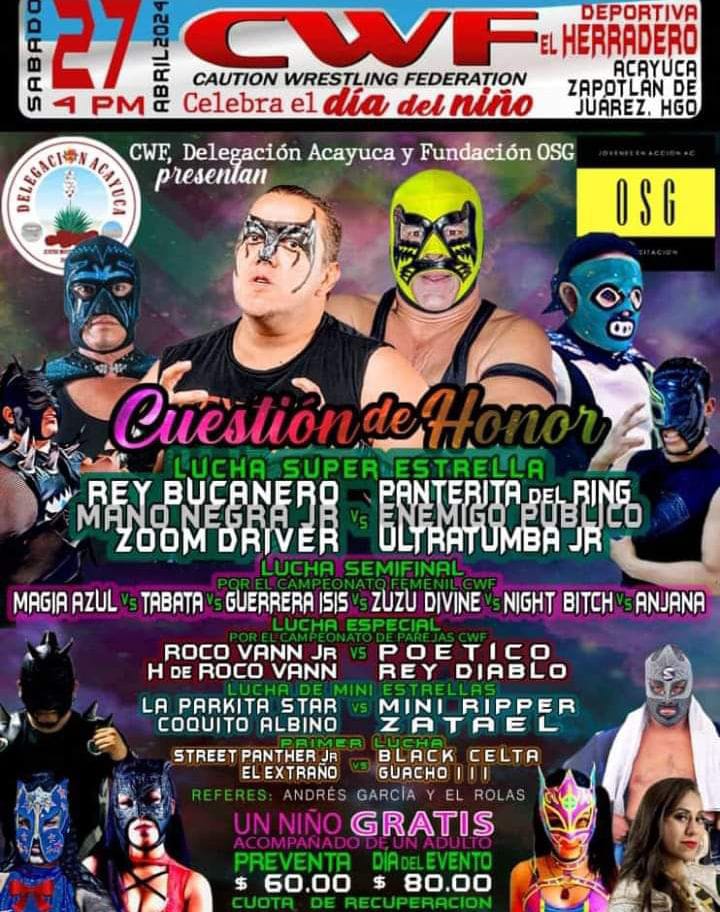 Bajo el título de “Cuestión de Honor”, CWF tiene preparado un espectáculo en el que podrás ver a personalidades como el Rey Bucanero contra Panterita del Ring; la batalla hacia la final el campeonato femenil; luchas especiales en parejas; enfrentamientos de “mini estrellas”; debuts de luchadores, y mucho más. También se contará con la supervisión de Andrés García y “El Rojas” como referís.