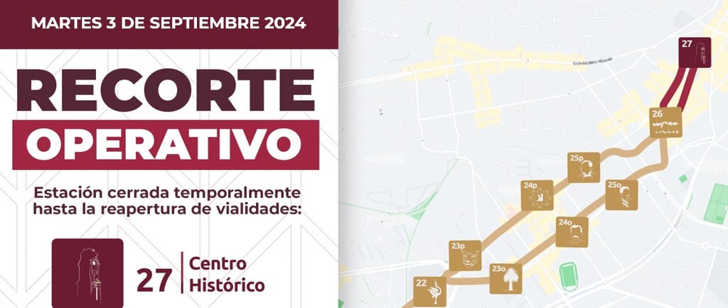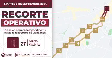 La Secretaría de Movilidad y Transporte de Hidalgo, a través del Sistema Integrado de Transporte Masivo de Hidalgo, anunció un recorte operacional temporal en la estación de la ruta Troncal 27 del Tuzobús, debido al cierre de vialidades en la calle Julián Villagrán y la calle Ignacio Allende, en la zona norte de Pachuca de Soto.
