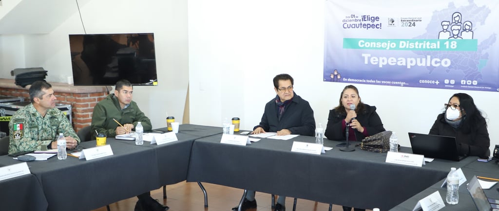 En una mesa de trabajo celebrada en el Consejo Distrital Local 18 Tepeapulco, encabezada por el secretario de Gobierno, Guillermo Olivares Reyna, se definieron los detalles del operativo de seguridad junto al secretario de Seguridad Pública, Salvador Cruz Neri, el comandante de la 18va Zona Militar, general Alfredo Salgado, y la presidenta del IEEH, María Magdalena González.