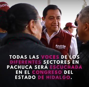 A veinte días de iniciar campaña por las más de cien colonias que representan el distrito 13 en Pachuca, el abanderado de MORENA, Andrés Velázquez Vázquez aseguró que en el Congreso del Estado, la gestión social, así como el fortalecimiento al presupuesto municipal y la revisión de su aplicación son temas vitales para el desarrollo social y económico de la zona y en sí, de todo el Estado.